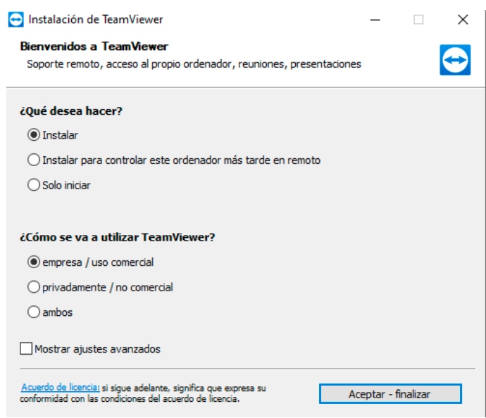 2. Selecciona la opción Instalar y el tipo de uso que le darás a tu TeamViewer, posterior a esto da clic en el botón Aceptar - Finalizar